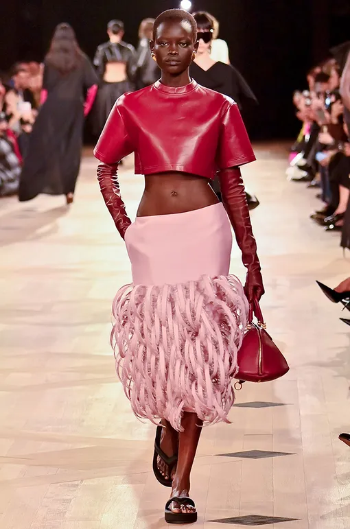 Этот образ из коллекции весна-лето 2026 - первоклассный урок, как легко гармонизировать два оттенка, используя мягкую кожу и блестящий атлас для усиления насыщенности тонов.