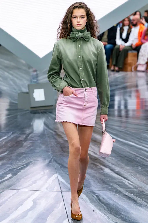 В своей дебютной коллекции для Dior Джонатан Андерсон стилизовал джинсовые рубашки цвета хаки с мини-юбками и сумками нежно-розового оттенка.