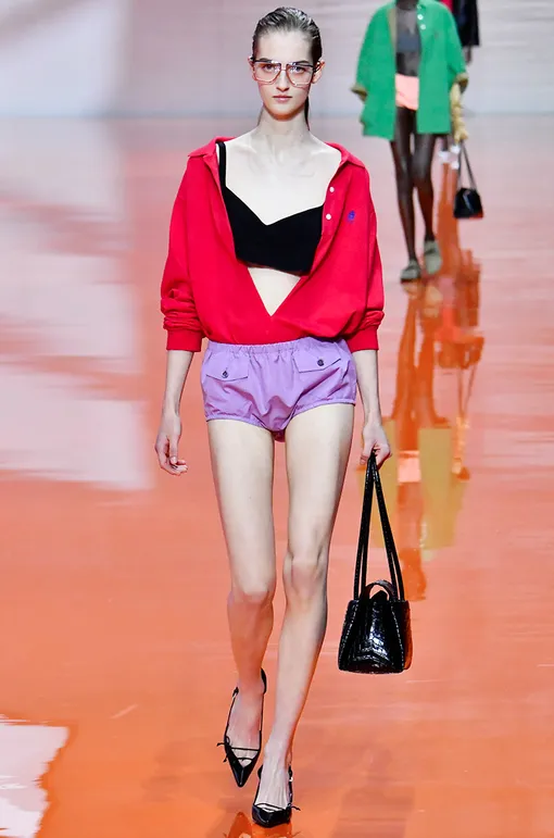 Если лавандовый кажется тебе немного старомодным и слишком спокойным, то энергии ему добавит яркий малиновый оттенок. Комбинируй верх и низ в двух цветах, как на показе Prada, или добавляй акцент за счет аксессуаров.