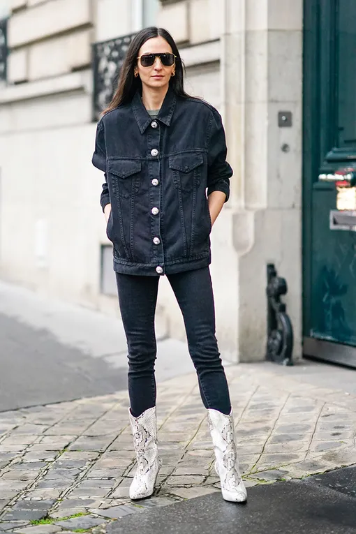 Черные скинни хорошо сочетаются с объемной курткой из черного денима и сапогами с фактурой, имитирующей кожу змеи. Такой образ отлично подходит для весны и прохладного летнего дня. Под куртку лучше надеть топ темного приглушенного оттенка. И не забудьте про трендовые солнцезащитные очки.