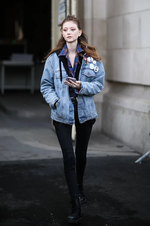 Черные скинни и голубая джинсовая куртка оверсайз тоже смотрятся хорошо. Такое сочетание может стать основой для многослойного образа в стиле гранж с использованием рубашки в крупную клетку и черных ботинок на шнуровке.