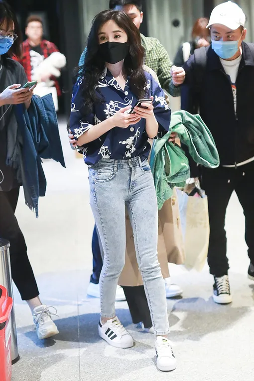 Для сочетаний с голубыми скинни хорошо подходят шелковые блузки с принтом. Размер принта зависит от типа вашей фигуры и количества оттенков, используемых в рисунке. Контрастные крупные двухцветные узоры выглядят очень эффектно. Даже в комплекте с кроссовками сочетание очень изысканное и стильное.