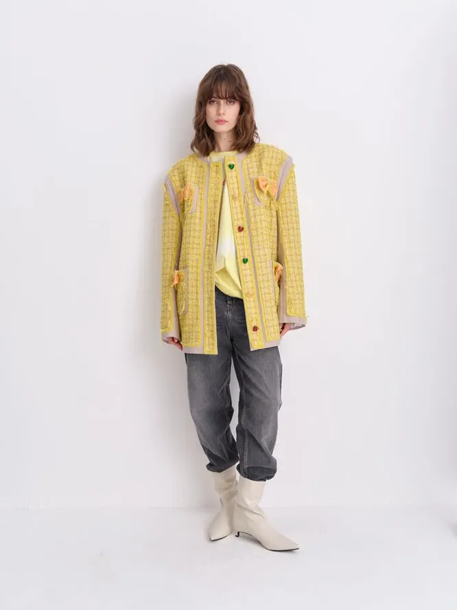 А вот дальше — вопрос твоего вкуса. Твидовый жакет с воротником-стойкой, твидовый жакет с карманами на лацканах, твидовый жакет с поясом — выбор в современных брендах просто огромный! Удачно впишутся в гардероб как самые базовые модели пиджаков прямого кроя с контрастной оторочкой (в духе Chanel), так и твидовые полубомберы — да, есть и такие.