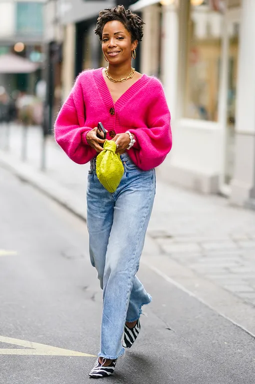 Здесь делай ставку на укороченный кардиган яркого цвета (например, розовый) и носи его с джинсами с необработанным краем, чтобы создать непринужденный и полный энергии образ, который будет уместен как днем, так и вечером — просто смени удобную повседневную обувь на каблуки.