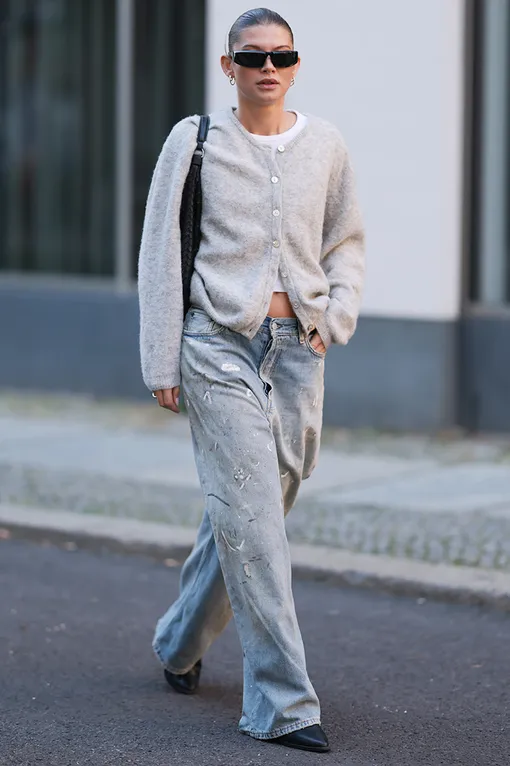 Свободные джинсы были самым популярным силуэтом 2025 года. Лучше всего их комбинировать с женственным приталенным кардиганом. Расстегни несколько пуговиц сверху, а если не прочь обнажить пресс, как берлинская инфлюенсер София Гайс, можешь расстегнуть и нижние пуговицы. В качестве нижнего слоя подойдет обычная бланковая футболка или однотонный лонгслив.