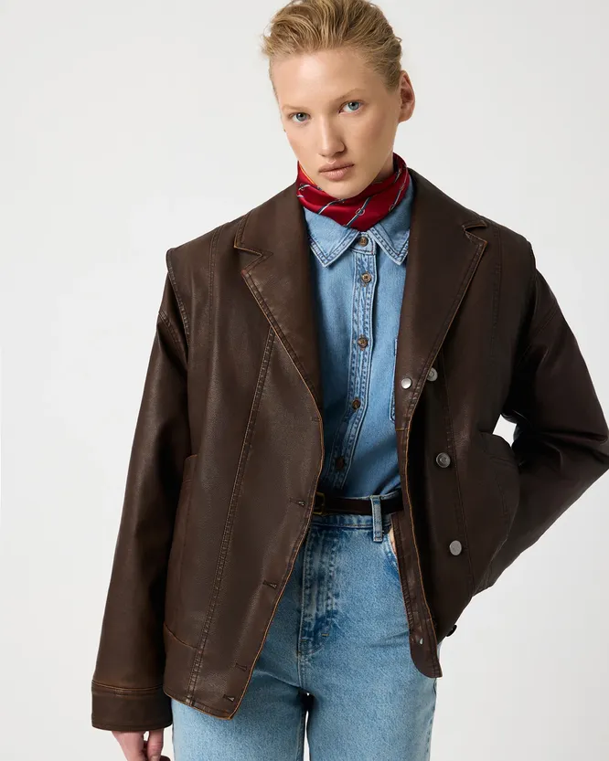 Ты можешь поискать «ту самую» куртку в винтажном магазине или приобрести пиджак из искусственно состаренной кожи. Сочетай находку с классическими брюками, свитшотом и сапогами с широким голенищем.