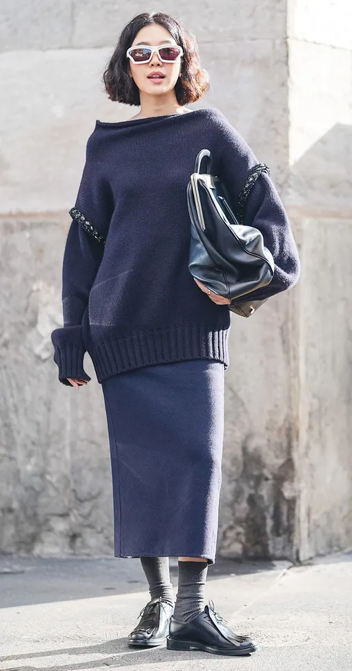 В этом сезоне юбки-миди — среди смых востребованных моделей. И оксфорды подходят к ним как нельзя лучше. Наиболее выигрышно, согласно инфлюенсерам, смотрятся тотал-луки в одной цветовой гамме — комбинируй вещи темно-синего или черного цвета, чтобы создать более универсальный образ, или попробуй миксовать парами модные оттенки сезона — коричневый или бордовый, коричневый и зеленый.