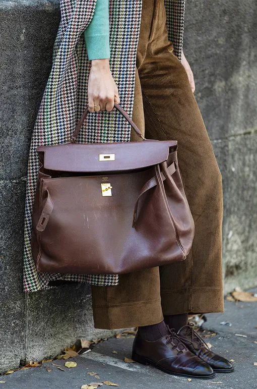 Вряд ли какой-либо цвет доминирует осенью 2025 года так, как насыщенный шоколадно-коричневый. Модные профи любят носить оксфорды в той же цветовой гамме — например, с вельветовыми брюками цвета и аксессуарами в тон, как в этом случае с шоколадно-коричневой сумкой Birkin. Добавить глубины образу можно за счет клетчатого пальто.