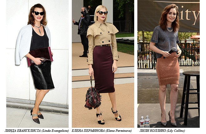 Самые изощренные настроения сезона, хотя бы частично, ссылаются на юбку строгой формы до колена, имеющую более емкое определение «карандаш». Юбка, способная подчеркнуть лучшие линии фигуры и убрать недостатки в центре внимания не только знаменитостей, но и профессиональных шопперов, советующих приобрести ее всем девушкам, спешащим с работы, напрямик в модное кафе или на романтическую прогулку. Нам нравятся образы, созданные Линдой Евангелистой, Еленой Перминовой и Лили Коллинз. Как и звездные модницы, выбирайте чуть укороченный верх (свитер или жакет), женственную обувь с узким носом или открытым мыском. И конечно, не принебрегайте украшениями — идеальное колье или серьги подчеркнут черты лица и линию шеи.