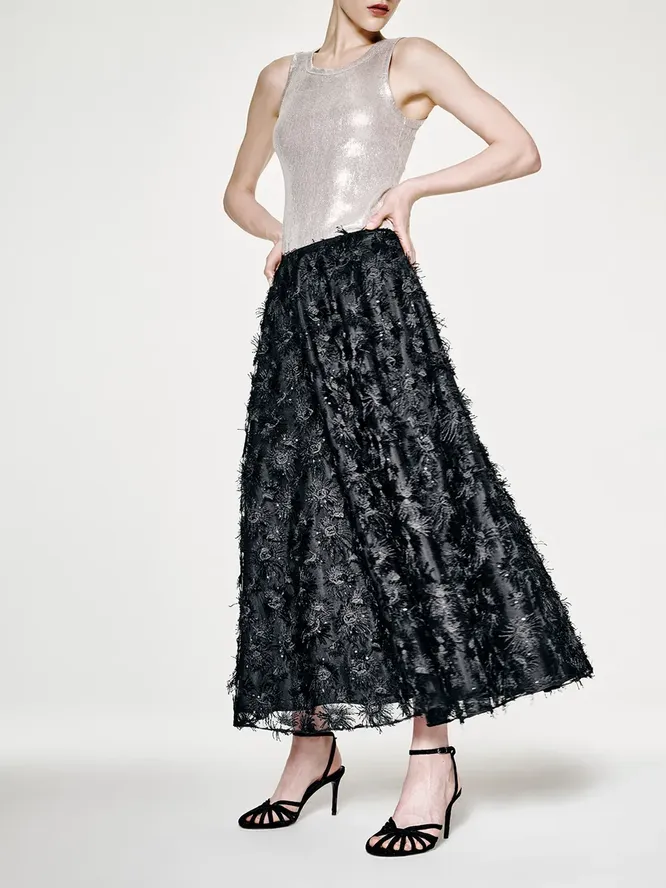 Джемпер или базовый кардиган у тебя в шкафу тоже наверняка водятся. Их освежит фактурная миди-юбка: в перьях, пайетках, с аппликациями – например, цветами. Такие модели вирусились в прошлом году, поэтому есть хороший шанс обзавестись новой вещицей со скидкой.