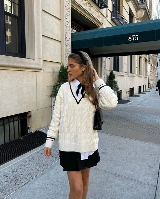 Сейчас жилеты на пике актуальности, в особенности костюмные. Для монохромного образа можно взять комбо «юбка + жилет», как на примере ниже. Альтернативным вариантом будут вязаные жилеты — такие уютные! Они отлично вписываются в повседневные образы с джинсами или миди-юбками — мы как раз на днях сделали подборку.