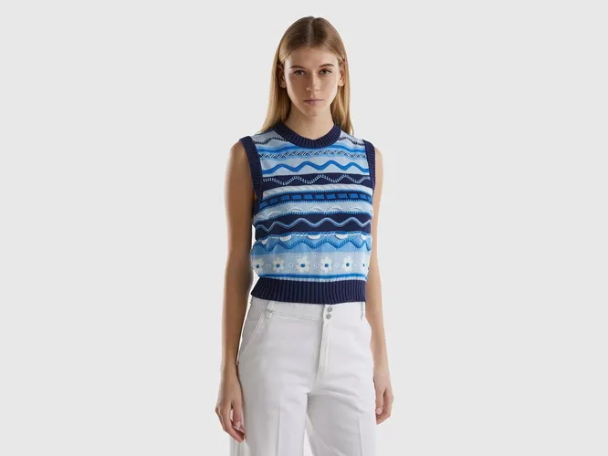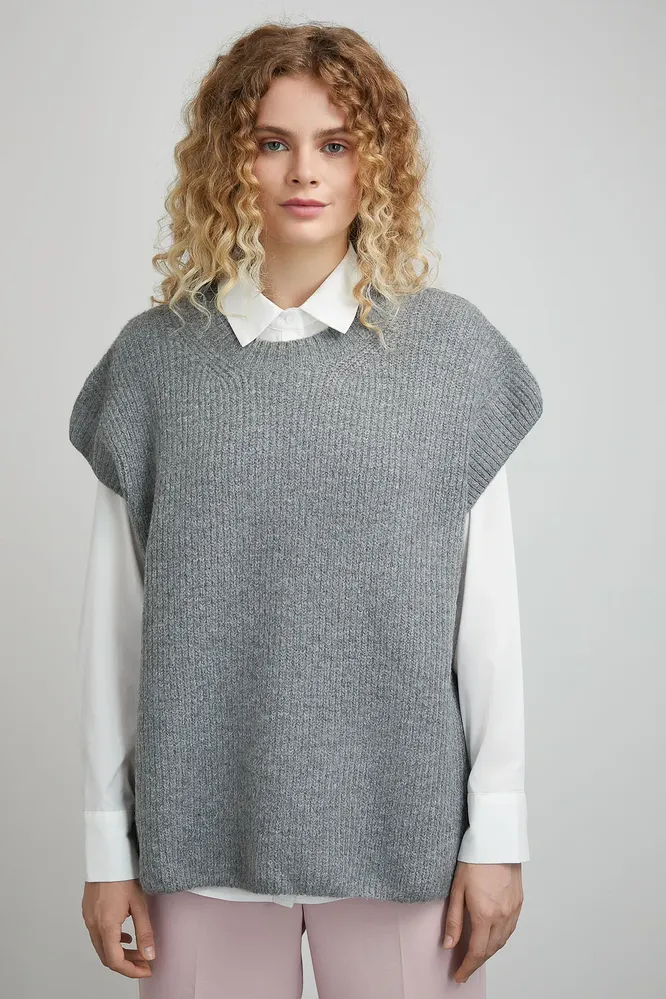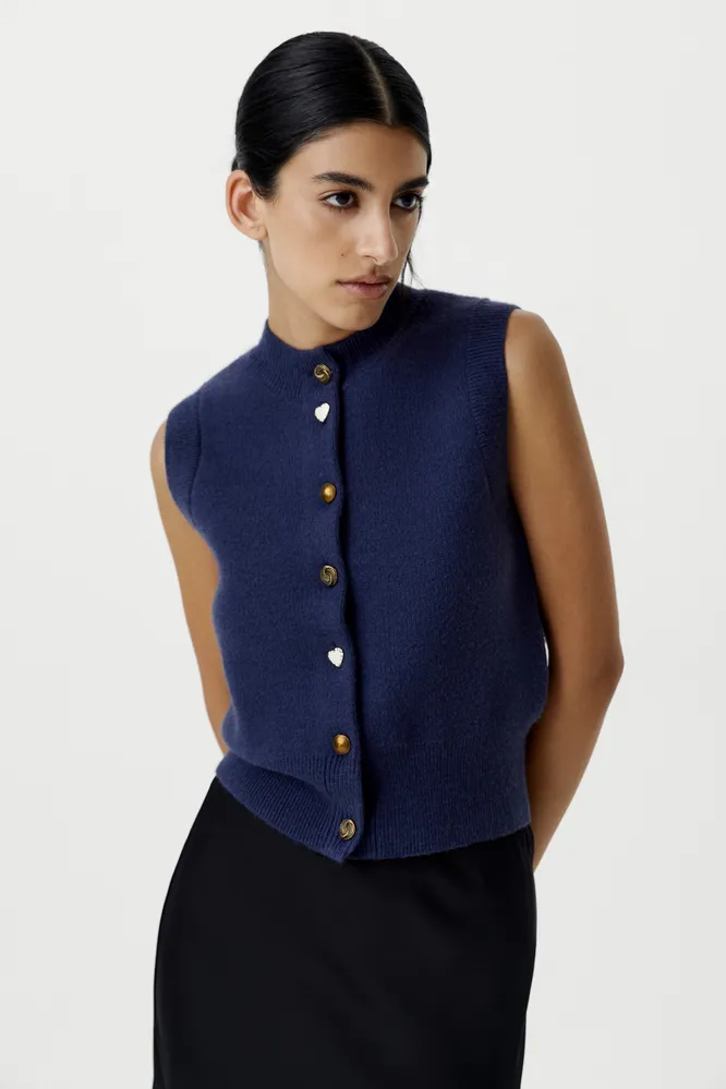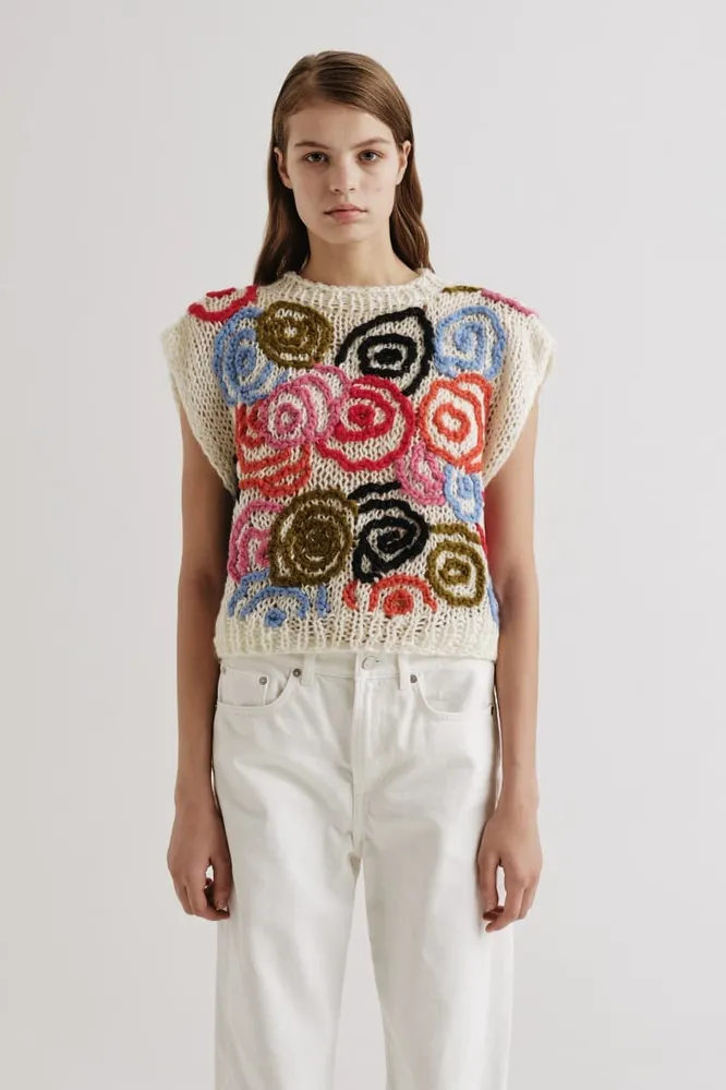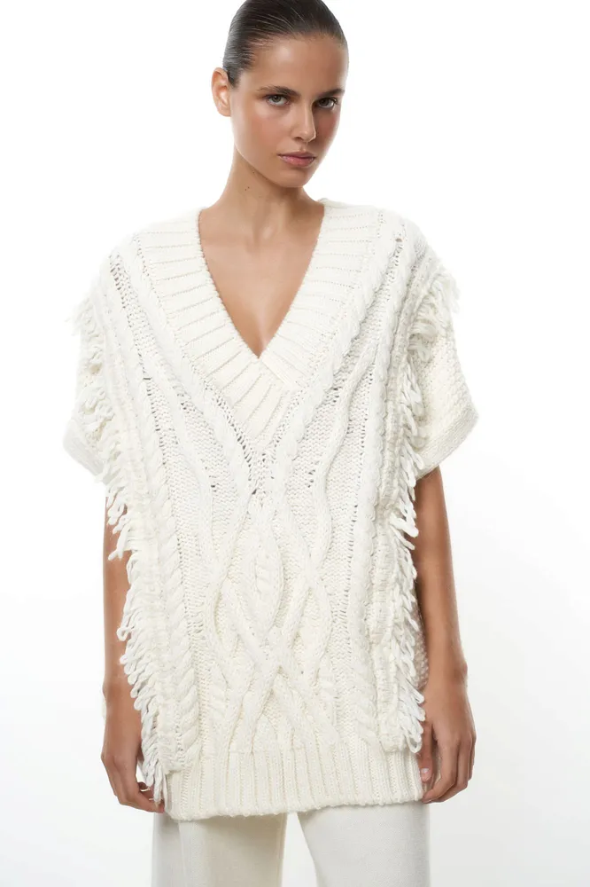 Эстетика коттеджкора и «дедушкиного» гардероба, может, больше не диктует модные правила, но все еще нам аукается. Поэтому вязаные жилеты (с косами или пестрыми принтами) сейчас крайне популярны. Чем чуднее, тем круче!