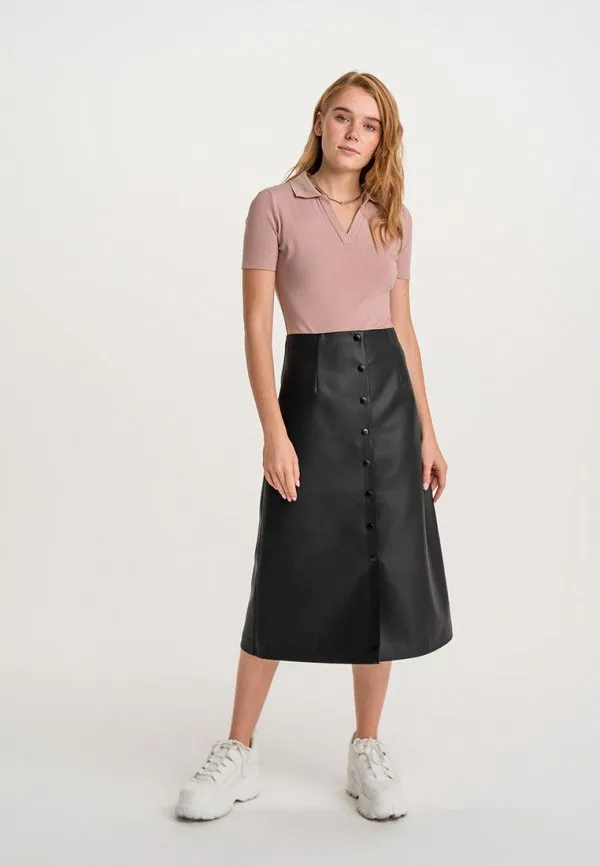 Длинная кожаная юбка и лонгслив с воротником поло