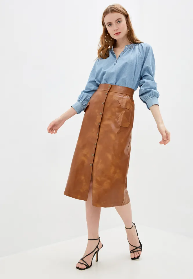 Коричневая юбка-миди из натуральной кожи красиво дополнит зимние уютные комплекты. Комбинируй вещь с теплой водолазкой или объемным свитером.