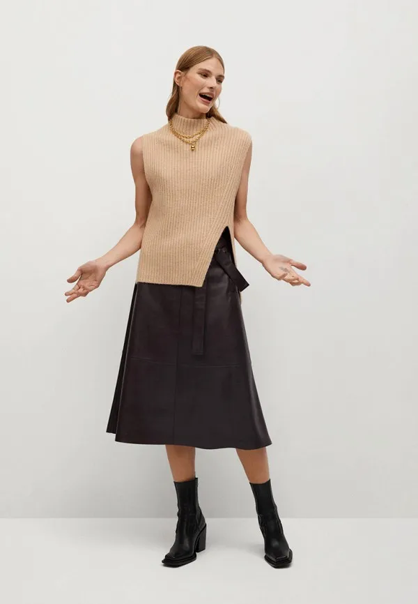 Коричневая кожаная юбка и вязаная безрукавка