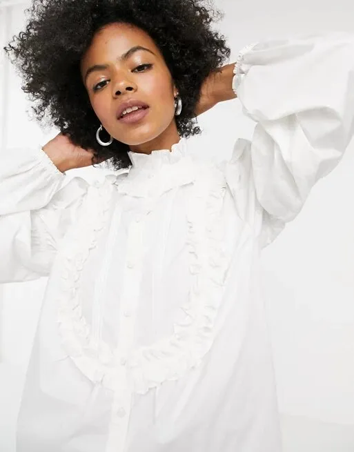 Вещь сочетает сразу несколько элементов викторианской моды — пышные оборки, высокий воротник и чуть приоткрытая спина. Блузка будет отлично смотреться со светлыми брюками или джинсами клеш.