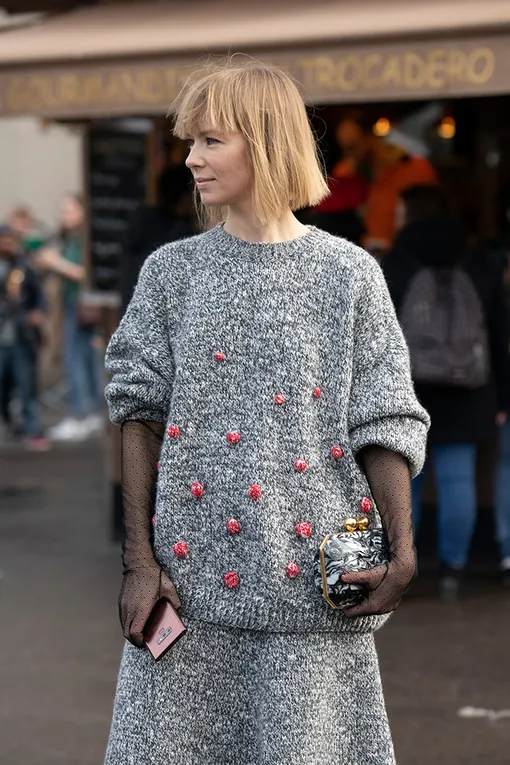 У свитеров с текстурной вязкой, будь то «косы» или прочие узоры, этой зимой появился конкурент. Модные соцсети и хронику стритстайла заполнил трикотаж с помпонами — небольшими вязаными шариками. Свитера с этой милой и забавной деталью так полюбились всем, потому что сразу добавляют образу нотку веселья и экстравагантности — а лишняя порция дофамина в хмурые и пасмурные дни явно не помешает.