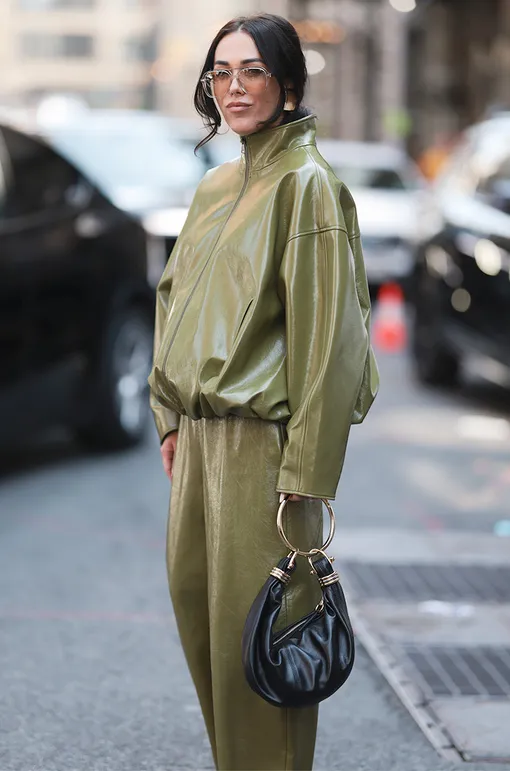 Конечно, многое решают фактуры: в этом случае очень эффектно миксуются лаковый костюм, хобо из мягкой кожи и гладкий металлик. Но сочетанию хаки с черным и золотым отдаем должное: союз благородный и не самый очевидный.