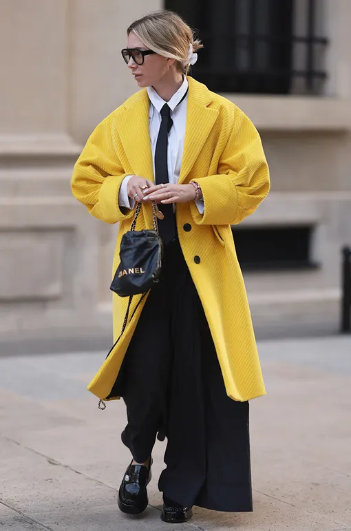 Желтый – один из самых заметных для человеческого глаза оттенков, обычно на него мы реагируем максимально быстро. «Перебивать» такой яркий цвет другими насыщенными оттенками не стоит: образ будет рябить. Поэтому ограничимся нейтральным черно-белым фоном – так желтый «заиграет».