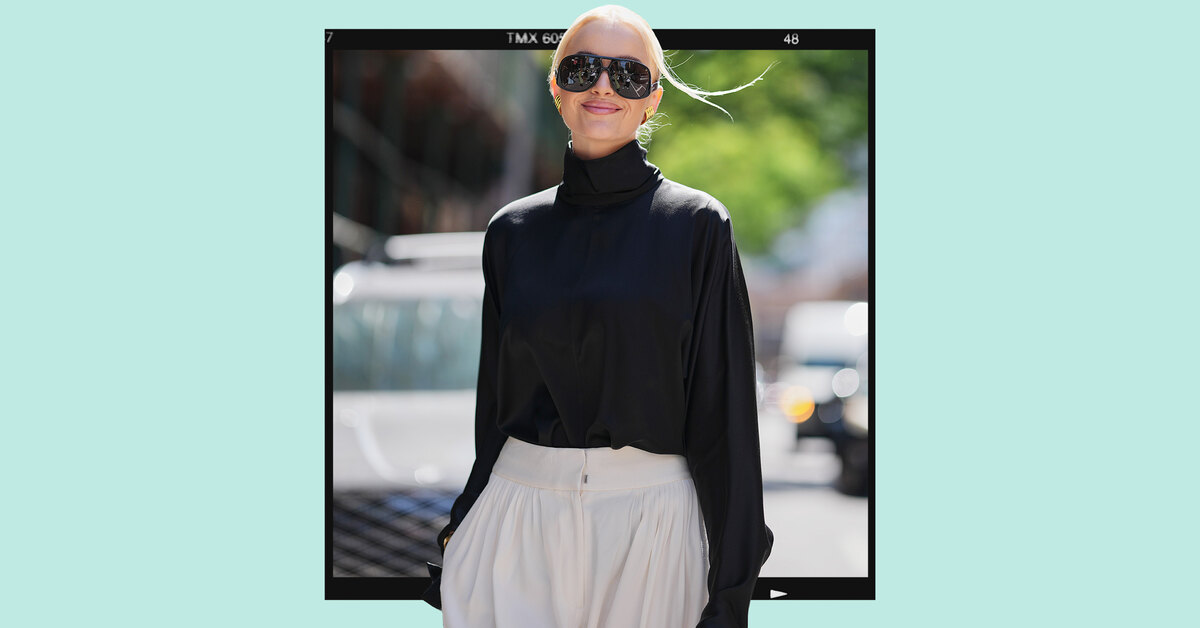 Основа основ – элегантный черный свитер или кашемировая водолазка, которые априори сочетаются с брюками на высокой посадке. Нужно ли здесь что-то добавлять?.. Ну, разве что стильную кожаную обувь, например, трендовые в этом сезоне остроносые ботильоны или строгие ботинки с тупым мысом.