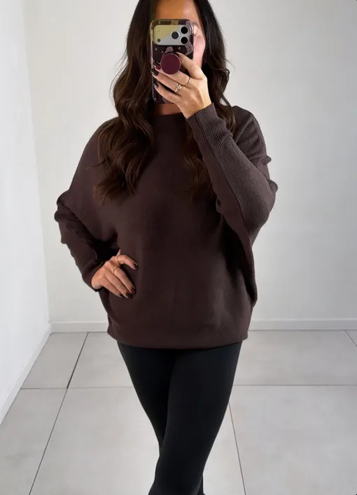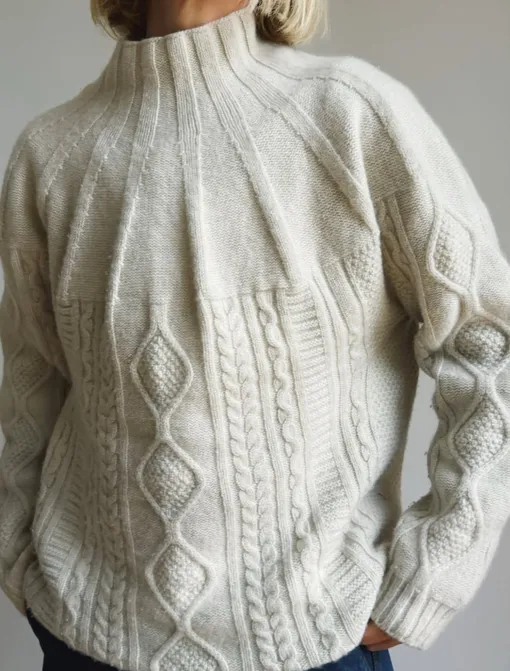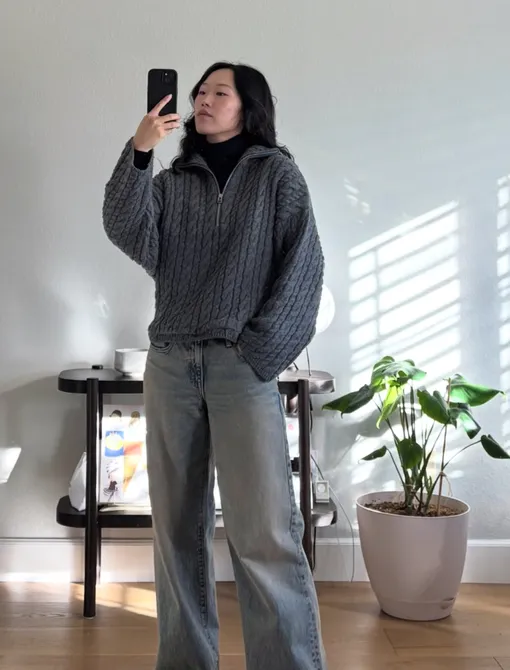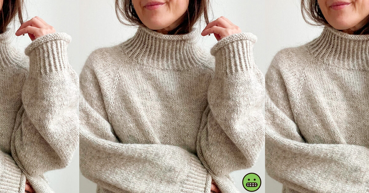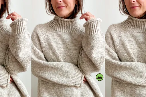 И вот почему: оверсайз-свитер со слишком крупными вязаными узорами визуально добавляет пару лишних сантиметров в области живота.