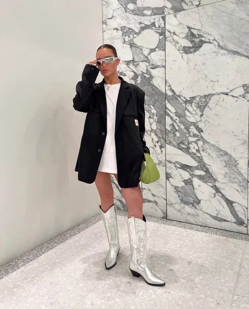 Серебро на ногах смотрится потрясающе! К тому же, одним этим цветом можно спасти даже самую приевшуюся базу. Вот удлиненная футболка, черный оверсайз-пиджак и они — серебряные сапоги. Как сказал бы Стас Просто Класс: «Ну какова!». Причем работает этот прием не только с массивной обувью. Помнишь, мы как раз недавно разбирали тренды на слингбэки? Особенно актуальными в сезоне весна-лета считаются модели с удлиненным серебряным мысом. Одна эта деталь добавляет образу «полированный» эффект, делает его выразительным.