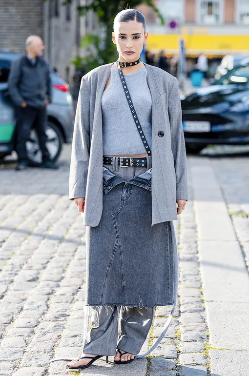 Серый — тот самый нейтральный цвет, который в составе монохромных луков обретает выразительность и индивидуальность. Сочетай разные его оттенки — от мокрого асфальта до стального, чтобы придать образу глубину и не забывай о многослойности. Юбка поверх брюк, как в нулевых, снова модный прием.