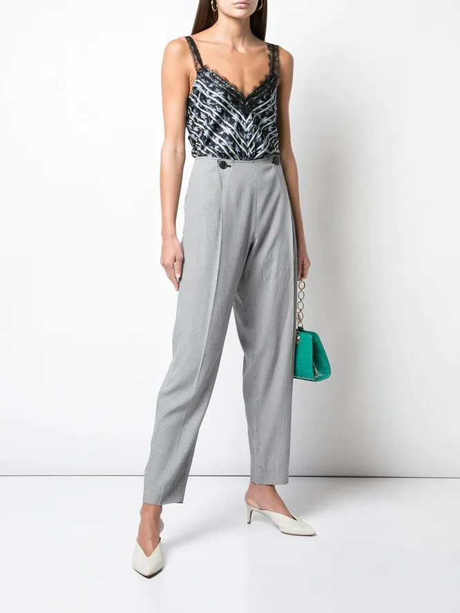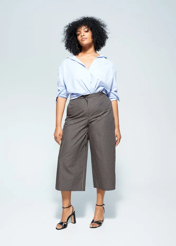 Как скорректировать пропорции тела? Надень брюки с высокой талией и укороченную объемную блузу в одном ансамбле. Если ты не пытаешься скрыть особенности своей фигуры под одеждой, купи женские штаны в клетку ради создания стильного образа. В таком наряде ты будешь выглядеть круто и стильно. Завершай образ удобными мюли или босоножками.
