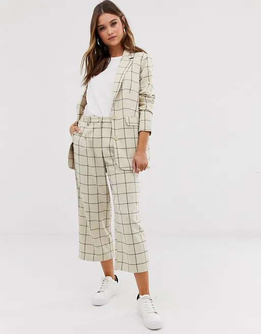 Не любишь оверсайз-силуэты? Тогда присмотрись к приталенным белым брючным костюмам в клетку. Выбирай штаны, расклешенные к низу, чтобы разбавить официальный аутфит. Женские черно-белые штаны в клетку отлично сочетаются с любыми оттенками, но особенно эффектным будет комбинация с оттенками белого. Под блейзер надевай однотонную белую водолазку, а на ноги — остроносые туфли или полусапожки.