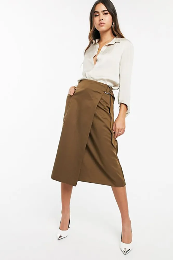 Строгая юбка-карандаш — слишком скучно. Сделать офисный наряд более дерзким поможет модель с запахом. Она не только задает характер образу, но и визуально вытягивает фигуру, а это приятный бонус!