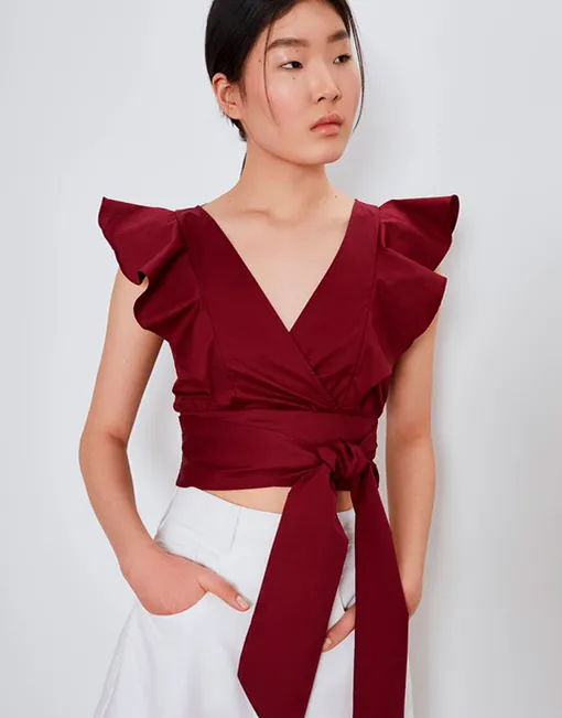 Короткий топ винного оттенка прекрасно гармонирует с белыми брюками палаццо. Подбери к этому комплекту туфли на высоком каблуке — эффект бесконечных ног гарантирован. Благодаря поясу на талии твоя фигура будет выглядеть утонченно. В повседневной жизни такой топ можно носить с джинсовой мини-юбкой или с брюками-бананами.