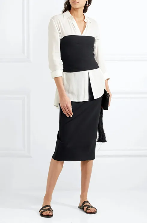 Черная юбка, белая рубашка — что может быть традиционнее? Вносим свежую (и, быть может, немного восточную) нотку в этот комплект, добавив широкий корсет. Важно, что этот образ работает именно в плоскости минимализма. То есть отсутствие декора, ограниченная цветовая гамма и соответствующие аксессуары. Не перебарщиваем!