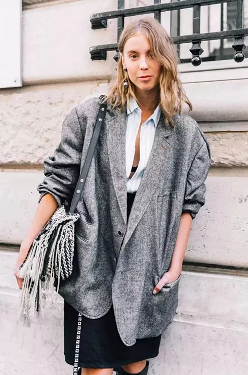 Свободные жакеты с увеличенной линией плеч сейчас очень популярны и хорошо играют на контрасте с узкой облегающей юбкой. Интересная деталь: свободная расстегнутая блузка, которая добавляет еще больше объема и небрежности в верхней части.