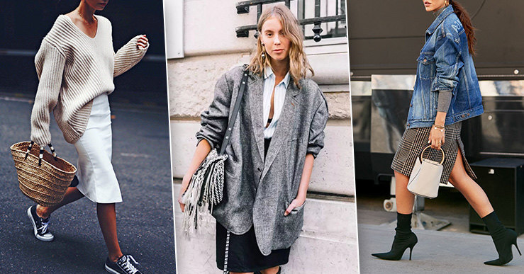 Сочетание юбки и объемного свитера — привычный ход. Все дело в нюансах. Свитер максимально объемный из возможного. Вместе привычных в таком случае лодочек — кеды или кроссовки. И необычная сумка. Соломенная — хороший вариант, но необязательно ограничиваться именно им.