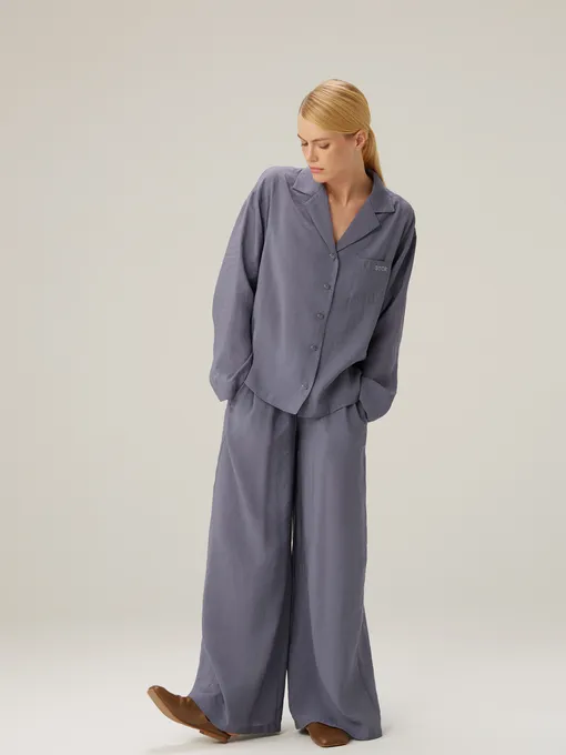 Комплект состоит из рубашки прямого кроя на пуговицах и длинных свободных брюк на мягкой резинке: так посадку брюк можно отрегулировать, чтобы тебе было удобно, но резинку видно не будет – ее прикроет рубашка. Комфорт, комфорт и только комфорт.