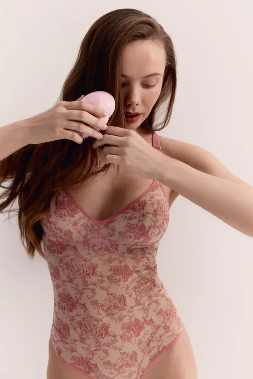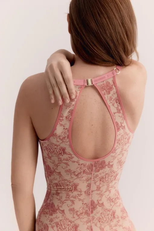 И, видимо, именно это чувство мы испытваем, глядя на Body Air — боди с отрезным лифом,глубоким декольте и акцентами на линии бедер и спины. И изящным, нежным, как безе, принтом под винтаж.