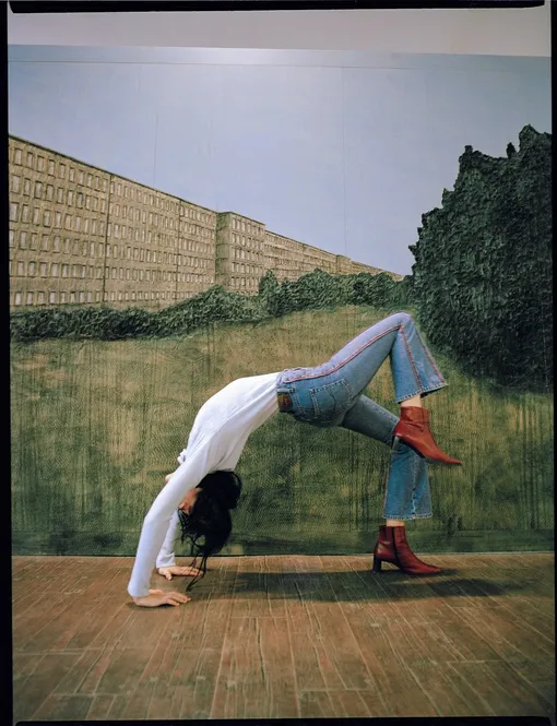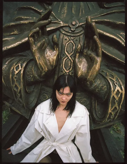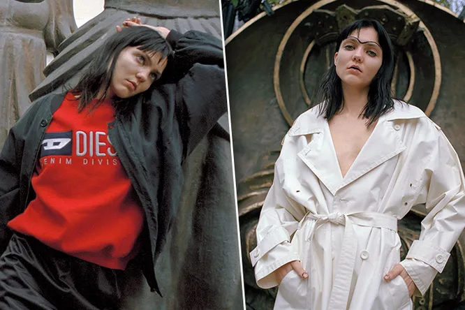 Винтажную одежду в гранжевом ключе дополнил соответствующий фон: двор музея ММОМА на Гоголевском бульваре.