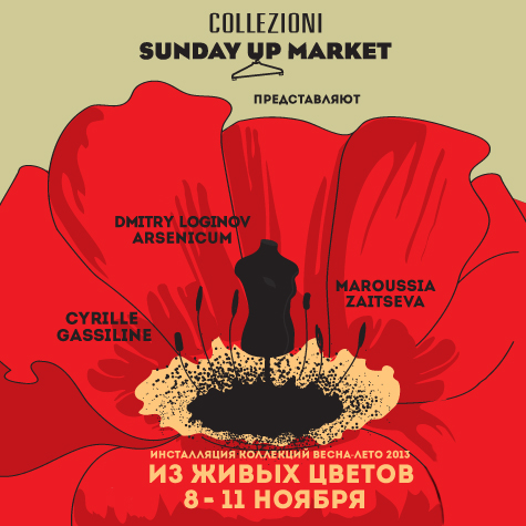 8 ноября Sunday Up Market и журнал Collezioni в рамках Next Destination Moscow в Универмаге Цветной на минус первом этаже представят инсталляцию ключевых платьев из коллекций весна-лето 2013 российских дизайнеров: Dmitry Loginov, ARSENICUM, CYRILLE GASSILINE, MAROUSSIA ZAITSEVA, которые будут выполнены из живых цветов.