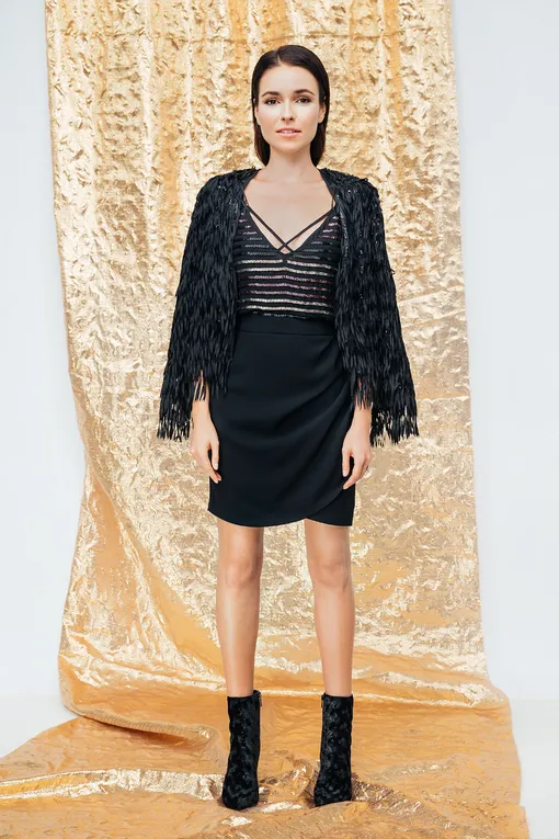 Черный жакет с бахромой — идеально для корпоративной вечеринки. Носи его с однотонными вещами с гладкой фактурой и туфлями или ботильонами на каблуках.