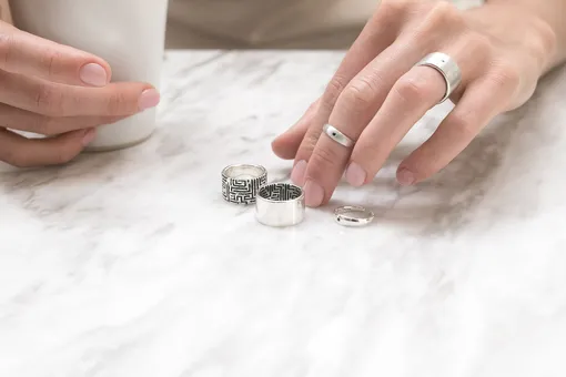 Кольца Navoti Ring c изображением лабиринта внутри и двумя ограненными камнями (черная шпинель и белый кварц, 1,5 мм) снаружи, стерлинговое серебро 925 пробы — 7000 рублей; Yakatama Ring с изображением лабиринта снаружи, стерлинговое серебро 925 пробы — 5700 рублей; Navoti Midi Ring, стерлинговое серебро 925 пробы, ограненный камень (черная шпинель, 1,5 мм) — 2200 рублей.