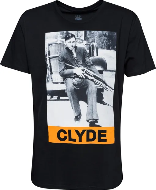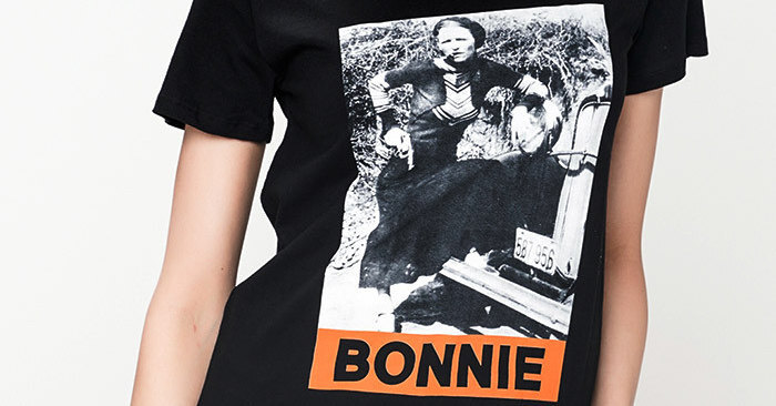 Вторая пара футболок посвящена американским грабителям начала ХХ века Бони и Клайду. Эта пара начинала с ограблений небольших магазинов во времена Великой депрессии и уже после перешла к разгромам банков. Свою популярность и даже культ влюбленные обрели не только из-за удивительной жизни разбойников и трагичной смерти, но и благодаря почти кинемаграфичному образу Бони, который создала пресса на основе фотографий пары. Так, Бонни описывали как любовницу гангстера, курящую сигары и эффектно владеющую стрельбой, хотя это была лишь часть ее сценического образа для фотосессии.