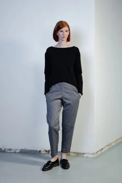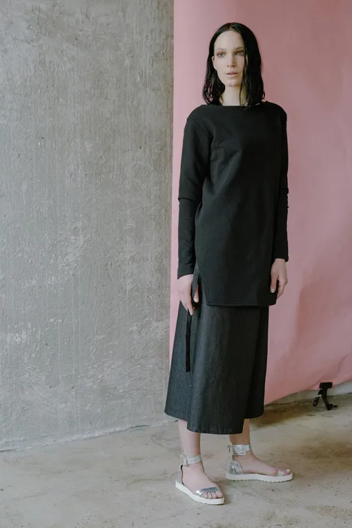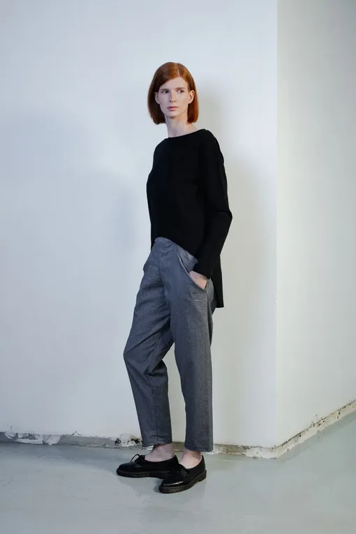 Лонгслив удлинен с одной стороны, что делает его вещью-трансформером: ты можешь носить «хвост» назад, как у фрака, или в более авангардном решении — длинной стороной вперед. Мягкий трикотаж джерси, свободная посадка и прямой силуэт сделают твой образ комфортным, что просто необходимо после праздников. Горловина «лодочка» и слегка спущенная линия плеча придают луку мягкие женственные нотки.