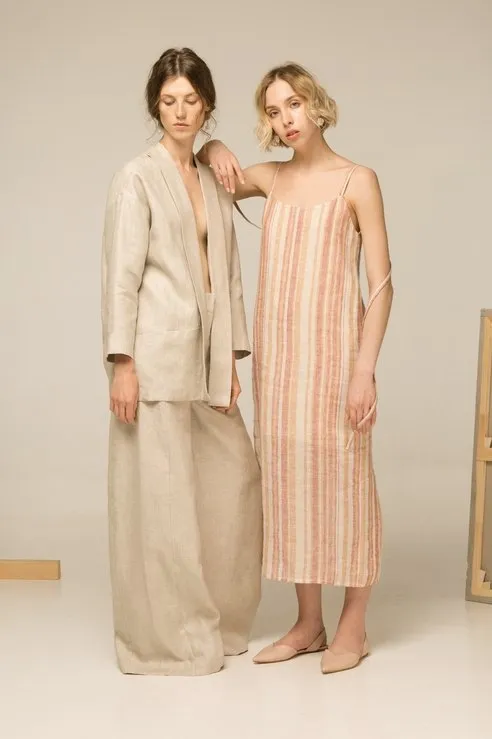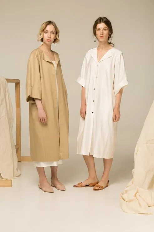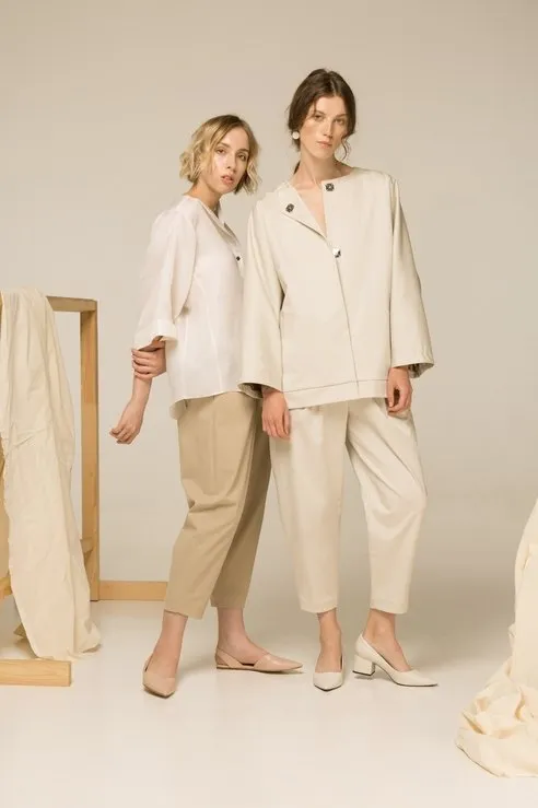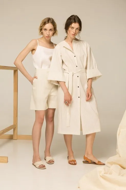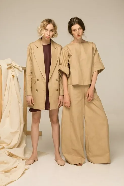 В основу летней коллекции легли традиционные для теплого времени года хлопковые и льняные ткани молочно-бежевых оттенков. Свободные минималистичные силуэты платьев, комбинезонов и пижамных костюмов с шортами станут хорошей базой как для офисных луков, так и для «отпускных» образов.