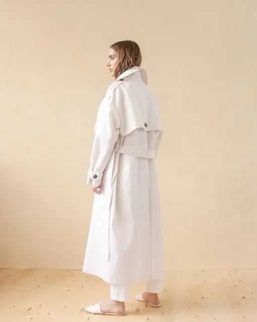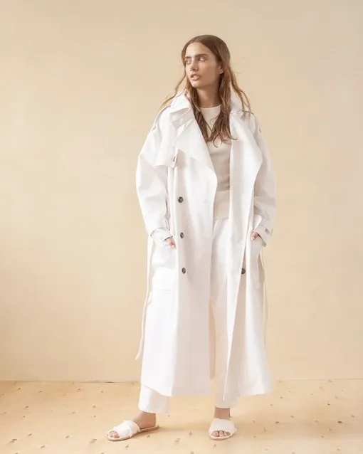 Плащ выполнен из 100% хлопка и представлен в белом, бежевом и темно-синем цветах. Благодаря актуальной длине до щиколоток и оверсайз-крою модель будет смотреться актуально как в классических «офисных», так и в ультрасовременных спортивных образах. Цена — 10 500 рублей.