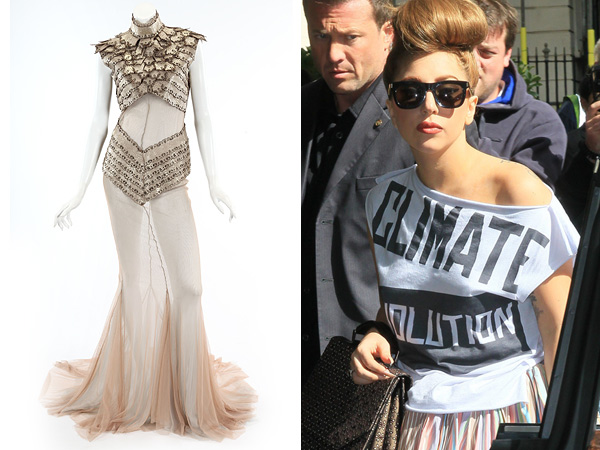 Певица выставила на аукцион несколько концертных нарядов, в том числе золотой плащ с питоном от Eddie Gavriilidis, резиновая маска для лица и головной убор от Franc Fernandez – дизайнера, придумавшего печально известное платье из мяса, а также металлическая маска от британского дизайнера Keko Hainswheeler, которую певица носила в клипе на песню Bad Romance.