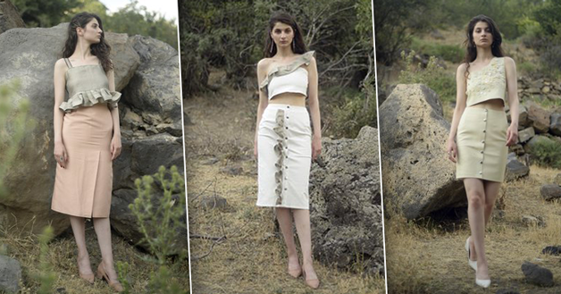 Любимая вещь самого дизайнера - молочная юбка-карандаш из кожзама с лазерной гравировкой картины Мартироса Сарьяна, любимого художника Ненси Аветисян (недавно девушка посетила его дом-музей во время последнего путешествия в Армению, благодаря чему коллекция приобрела особое звучание).