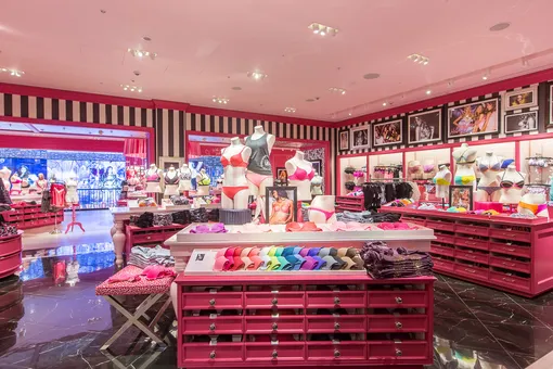 Дизайн магазина возносит гламур и изысканность на кардинально новый уровень. Фасад и витрины выдержаны в розовых тонах, а оформление интерьера построено на игре контрастов. Подобно театральным кулисам, вход в магазин выполнен в темной цветовой гамме и несет в себе предчувствие захватывающего действа. На стенах – вневременная галерея черно-белых фотографий супермоделей Victoria’s Secret. Внутреннее пространство магазина взрывается ярко-розовыми красками, восхищая посетителей шикарной мраморной лестницей и огромными светильниками. На экранах – культовые моменты из Victoria’s Secret Fashion Show. Зона примерочных кабин напоминает роскошный будуар с мягкими пуфами и мебелью, изготовленной за заказ.