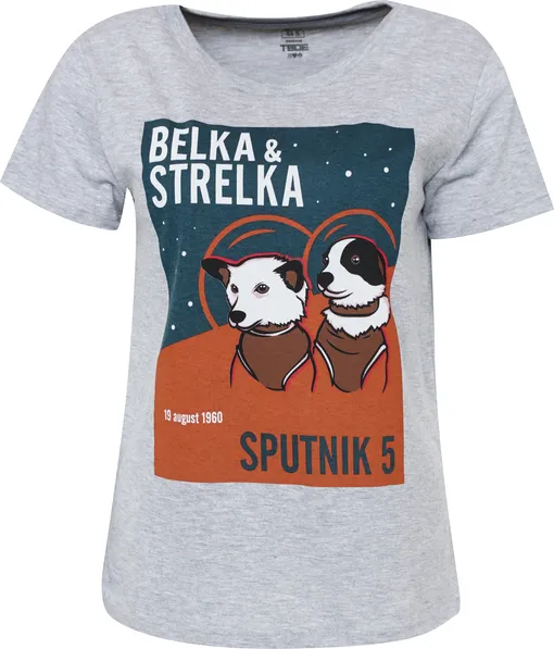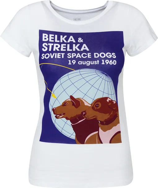 На женских моделях изображены главные «ушастые» покорители космоса — собаки Белка и Стрелка. А впрочем, девочкам вполне подойдут и мужские футболки.
