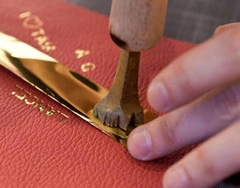 Техника персонификации сумки сложна. Мастер прижимает золотистую фольгу деликатным штампом, обернутым в фетр. Одно неловкое движение может превратить фольгу в пыль. Следующий шаг состоит из нагревания металлических заготовок букв и символов и нанесения штампа, составленного из них, на изделии. Горячая золотая фольга остается на коже изделия, остальная ее часть удаляется протиранием мягкой тканью.