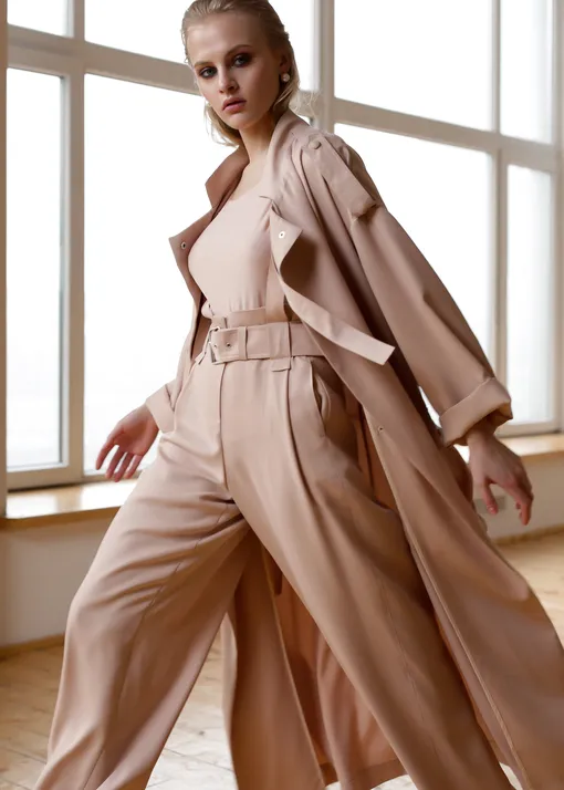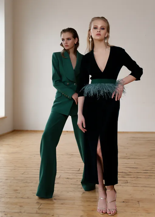 В коллекции представлены плащи, брючные костюмы, коктейльные платья, блузы и юбки.